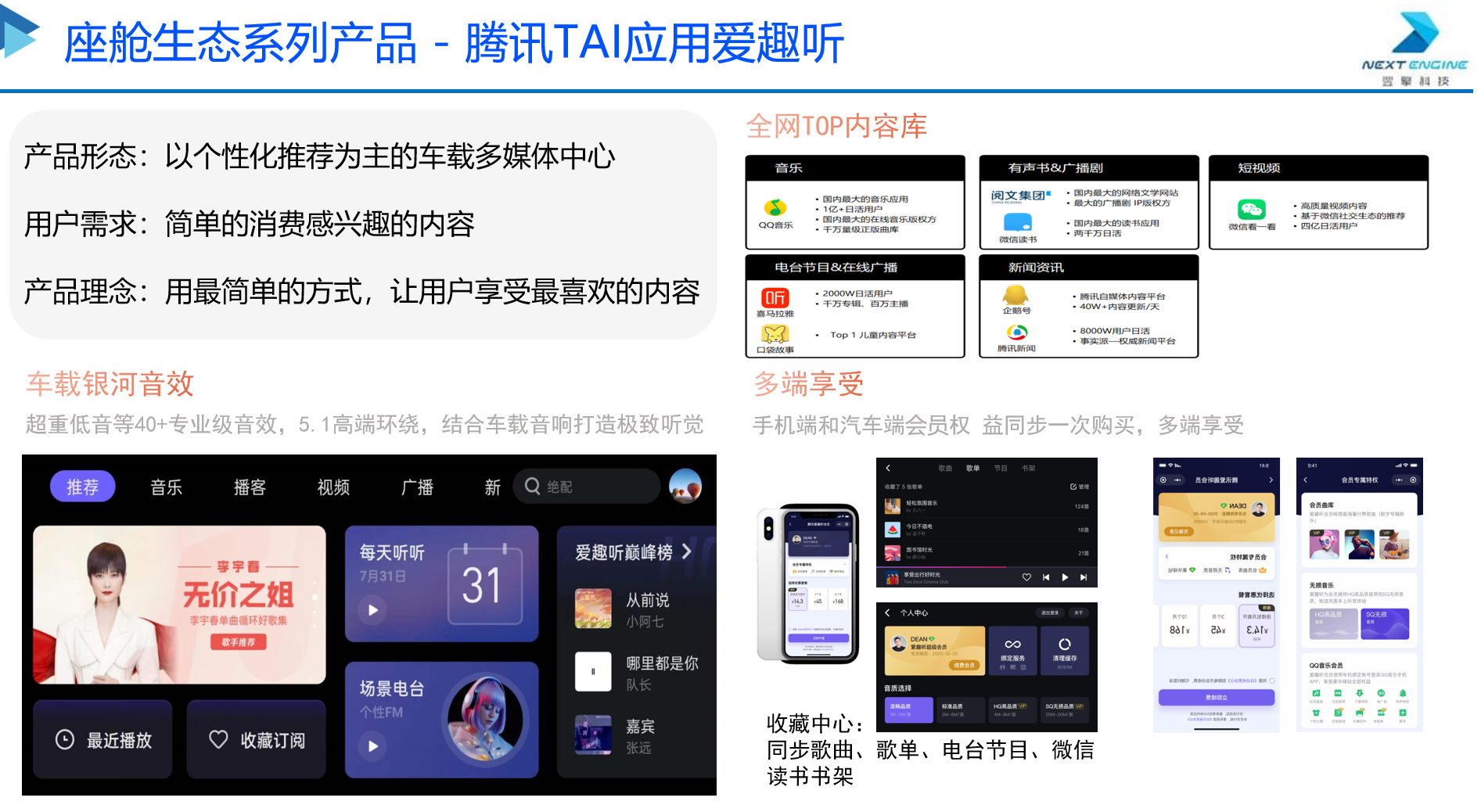 沉浸式、混合音视频产品,将抖音短视频、西瓜视频、头条音频等内容与字节智能推荐技术相结合,智能拍摄抖音分享,构建车载场景下的娱乐内容和服务体系。